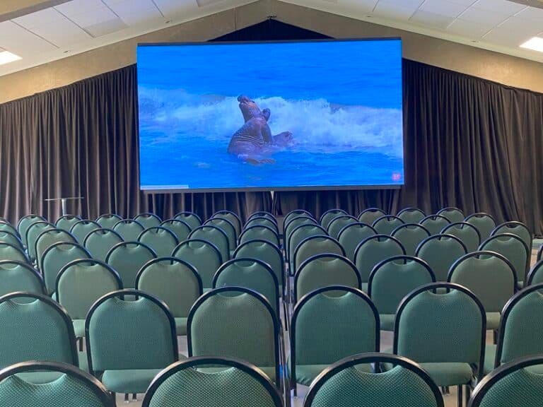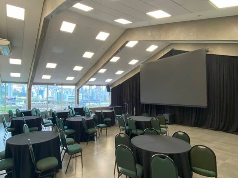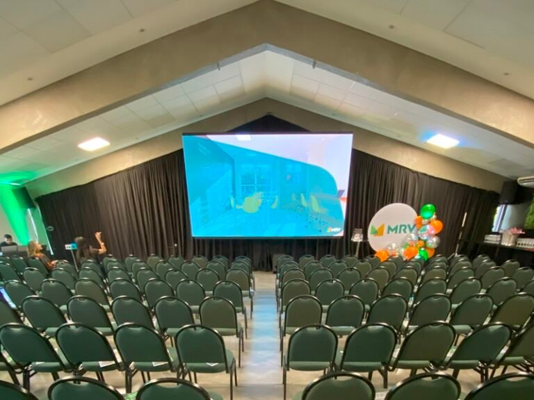 Equipamentos modernos inclusos: projetor, telão, microfone, caixa de som, mobiliários, internet.